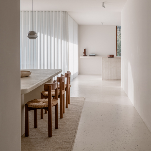 "Verbessern Sie Ihr Esserlebnis zu Hause mit unserem Muret Esszimmerstuhl." Lang tafeln? Kein Problem dank des bequemen Bouclé-Sitzes und der Armle...