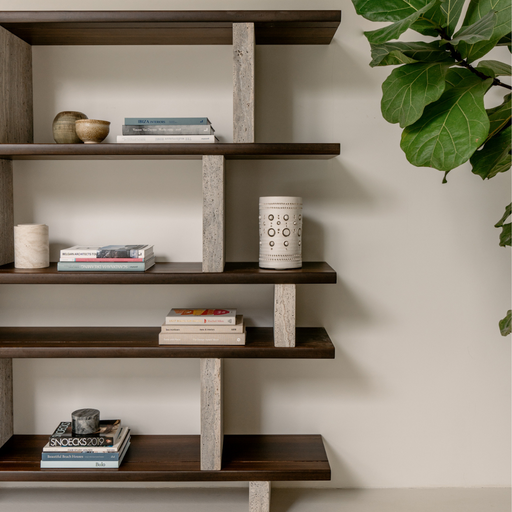 Die perfekte Kombination: Travertin und Walnuss. Unser Merpins offener Wandschrank hat beides! Dieser Wandschrank besteht aus Walnussregalen. Auf d...