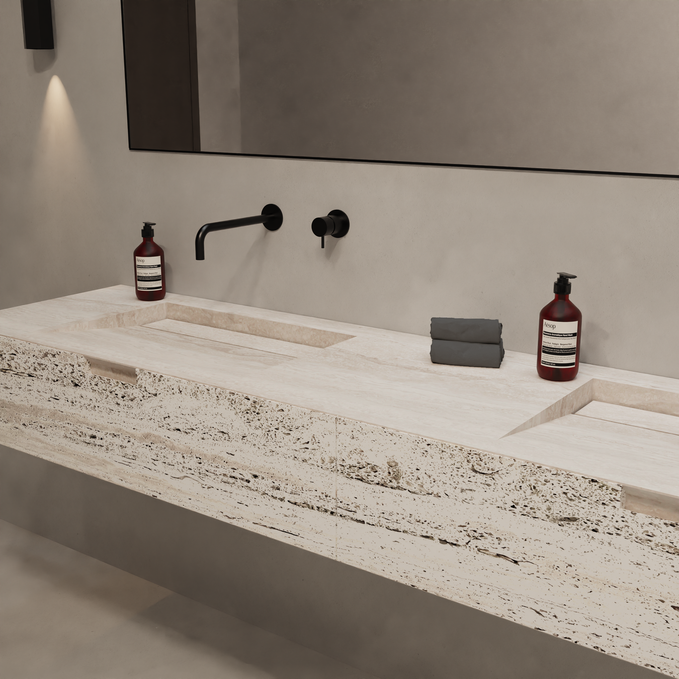 Travertine is a limestone that is naturally formed by mineral deposits in hot springs. It has a characteristic porous structure with subtle color variations, ranging from beige and sand colors to warm brown tones. This makes each travertine tile, sink, or slab unique.