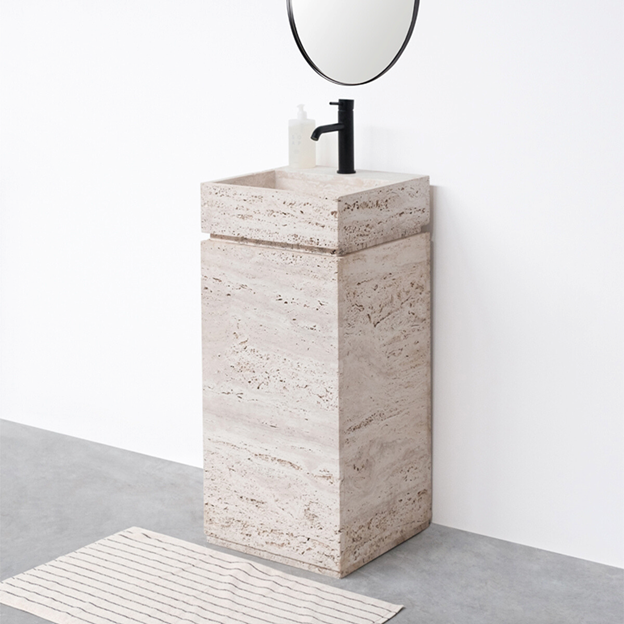 • Travertine hand basins: Compact and stylish, ideal for smaller bathrooms or toilet spaces. For example, the Porto hand basin in white travertine or Chemery hand basin.