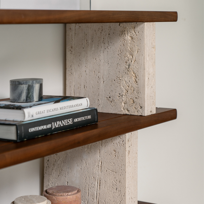 Die perfekte Kombination: Travertin und Walnuss. Unser Merpins offener Wandschrank hat beides! Dieser Wandschrank besteht aus Walnussregalen. Auf diesen Regalen kannst du all deine Lieblingsstücke platzieren. Der perfekte Ort, um Atmosphäre in deinem Wohnraum zu schaffen. Die Säulen dieses Wandschranks sind aus Travertin gefertigt. Diese schöne Kalksteinsorte hebt den Schrank dank ihres Aussehens auf ein höheres Niveau.